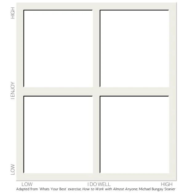 Then, add each of those projects and tasks to the grid, differentiating between those you do well (low to high) and those you enjoy doing (again, low to high). The tasks you do well and that you enjoy will appear in the upper right corner, and so on.